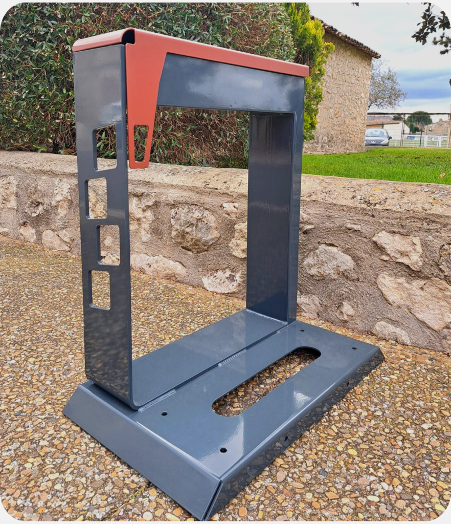 Recharge and be on the safe side. Support the growth of the EAB with our intelligent charging point. Designed and manufactured in Mollégès, this new-generation bike stand does more than just stabilise the cycle: it incorporates a secure recharging socket. Its unique concept allows users to place their charger in a dedicated compartment, locked by its own padlock, thus avoiding any risk of theft or damage during charging. Compatible with U-shaped attachments for maximum frame security, this equipment is the ideal solution for businesses, railway stations and public car parks wishing to offer a premium service to connected cyclists.